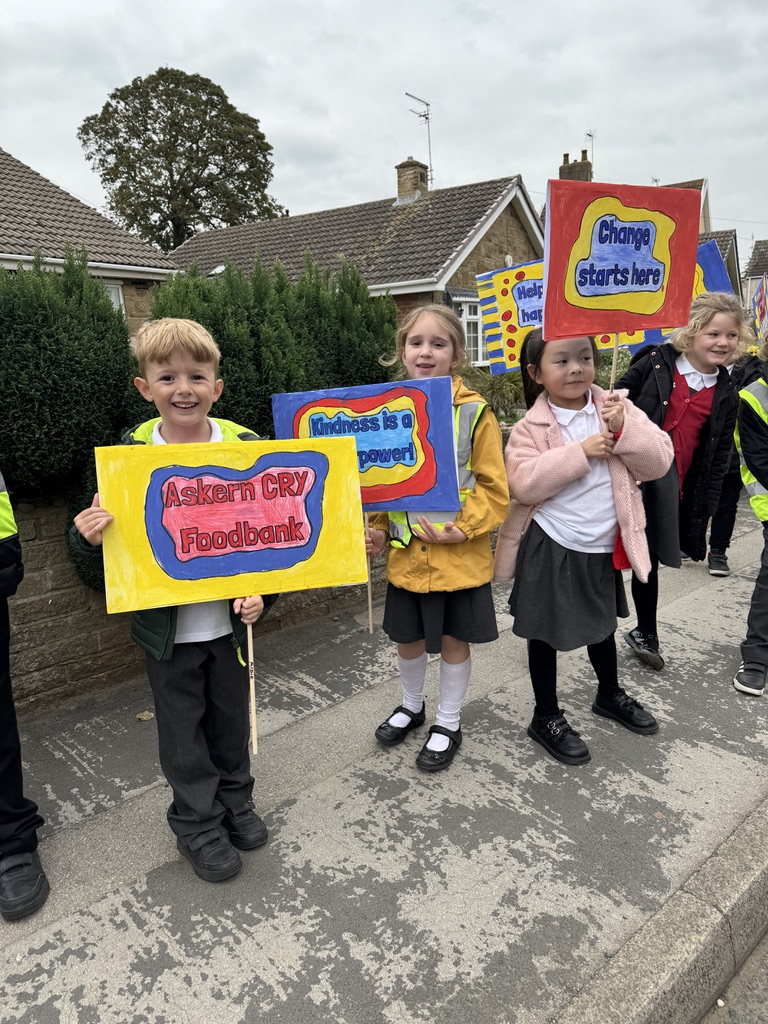 Moved by this learning, the children chose to take action themselves. After learning about food poverty, pupils worked closely with Askern CRY Foodbank, organising a march through Norton with carefully designed pop-art placards to raise awareness and collect donations. This act of service helped children connect their learning to real needs within their community.